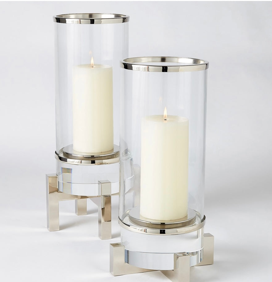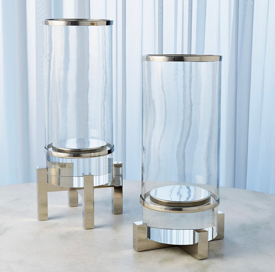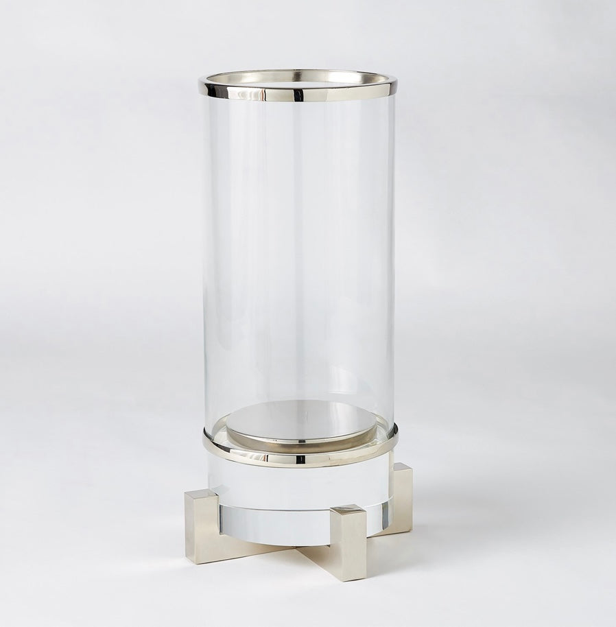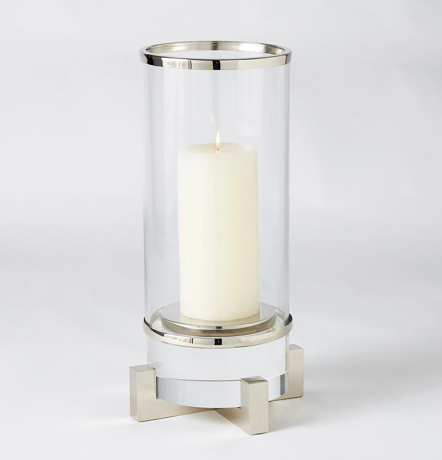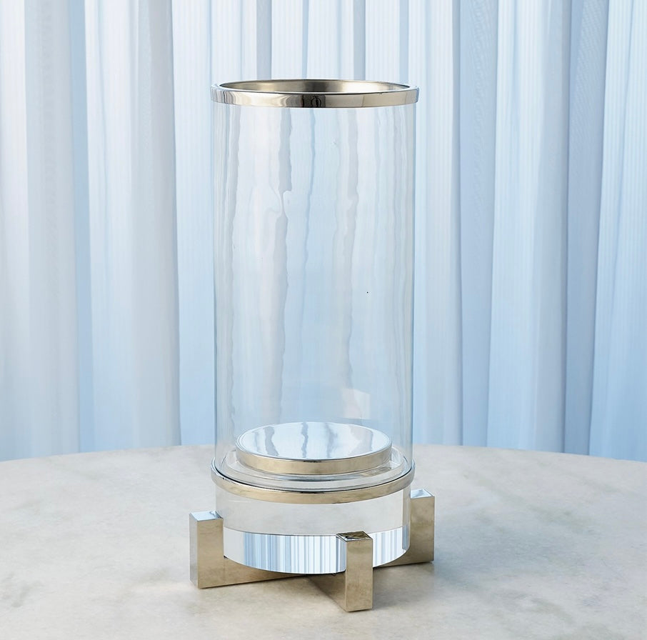 - Elegant cylinder hurricane lantern with polished nickel rim & glass body