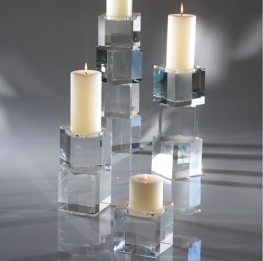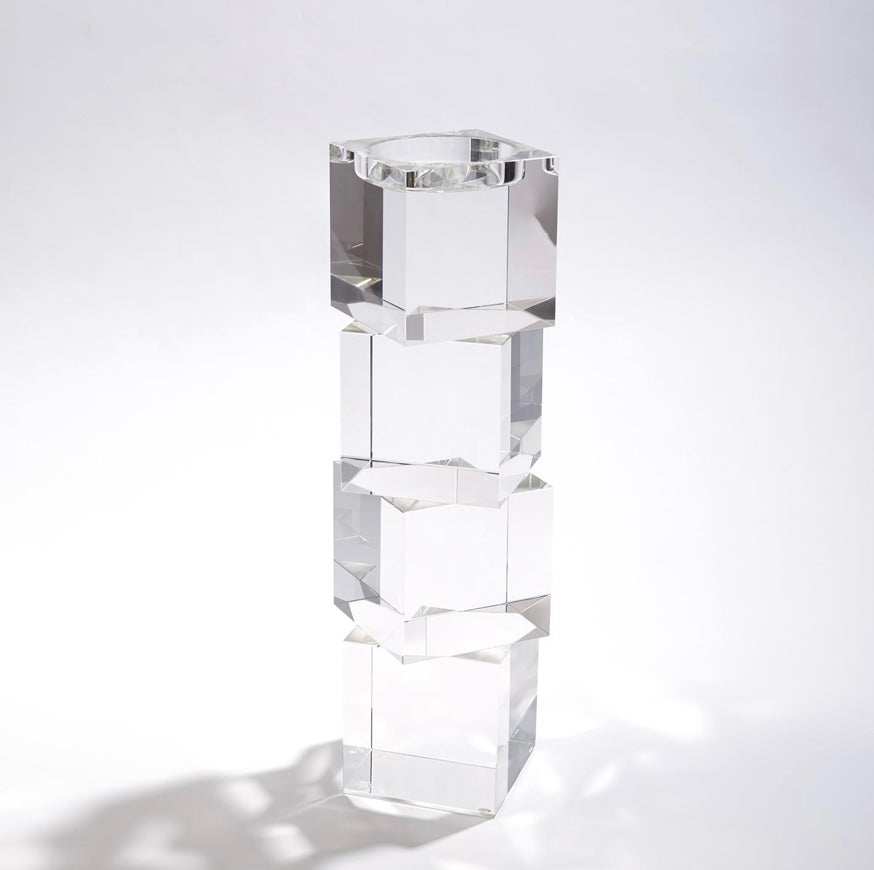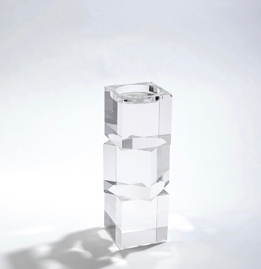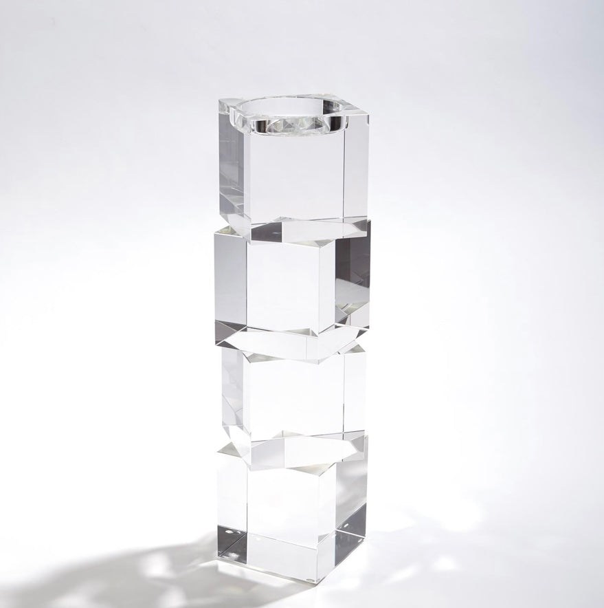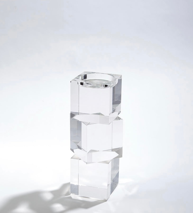 Polished lead crystal cubes are stacked in a stair step to create over scale graceful candleholders. Each candleholder is wrapped in a black fabric bag and packed in a polished white gift box. Please do not place in direct sunlight, crystal can magnify the light of the sun and potentially cause a fire hazard.
