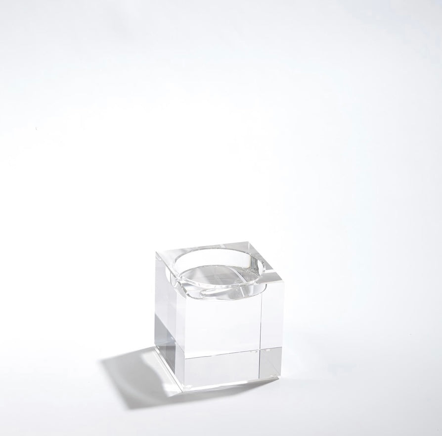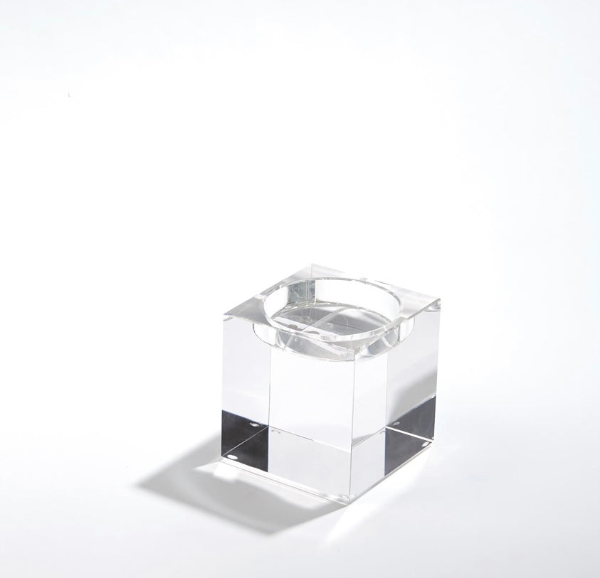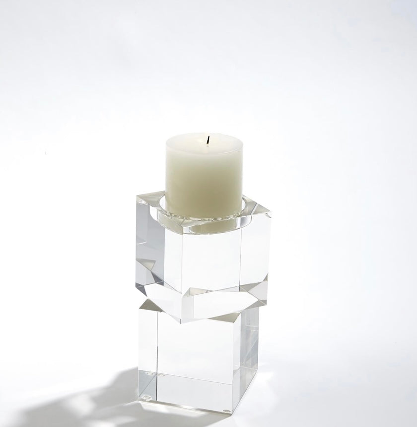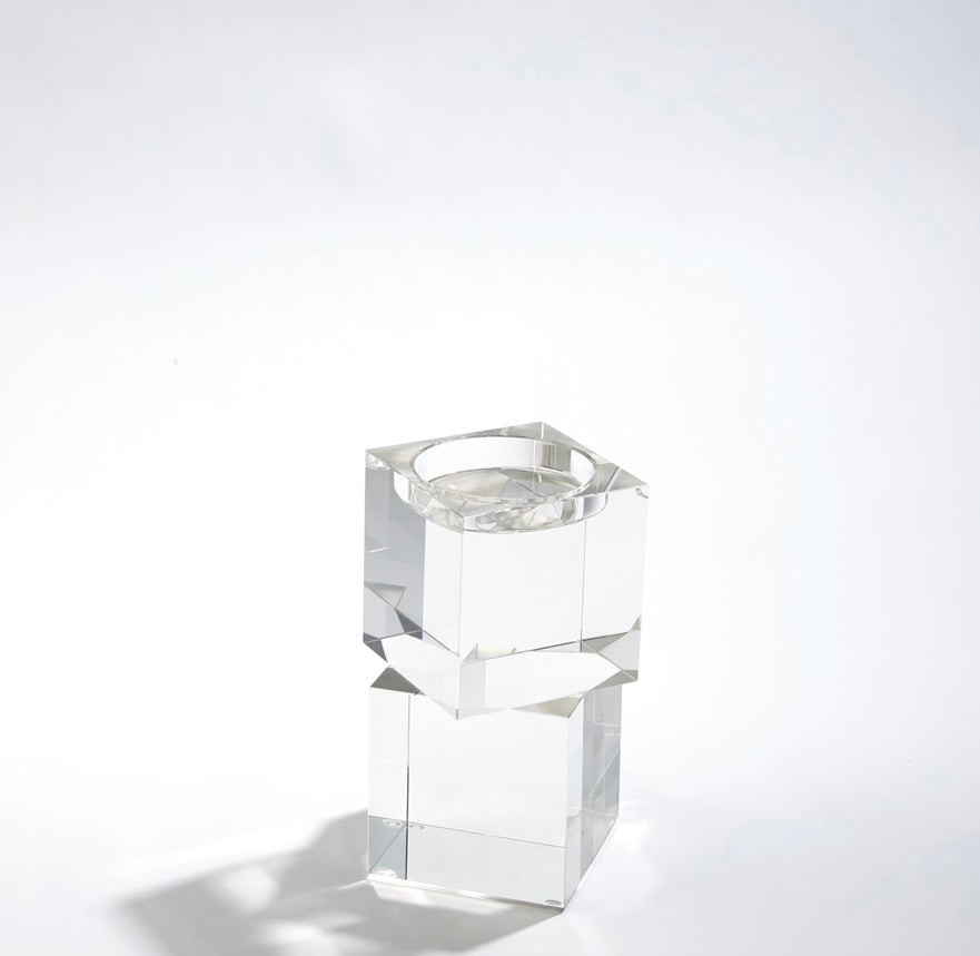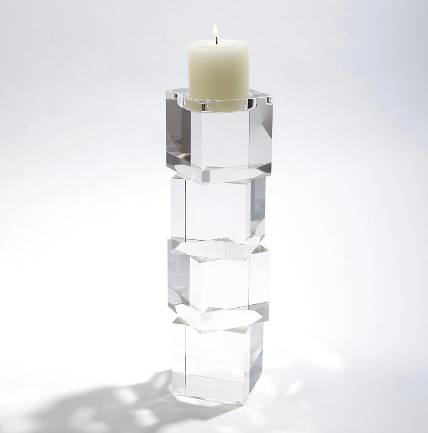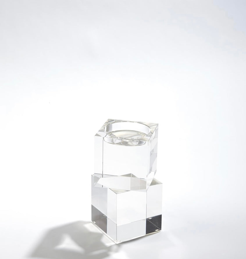Polished lead crystal cubes are stacked in a stair step to create over scale graceful candleholders. Each candleholder is wrapped in a black fabric bag and packed in a polished white gift box. Please do not place in direct sunlight, crystal can magnify the light of the sun and potentially cause a fire hazard.