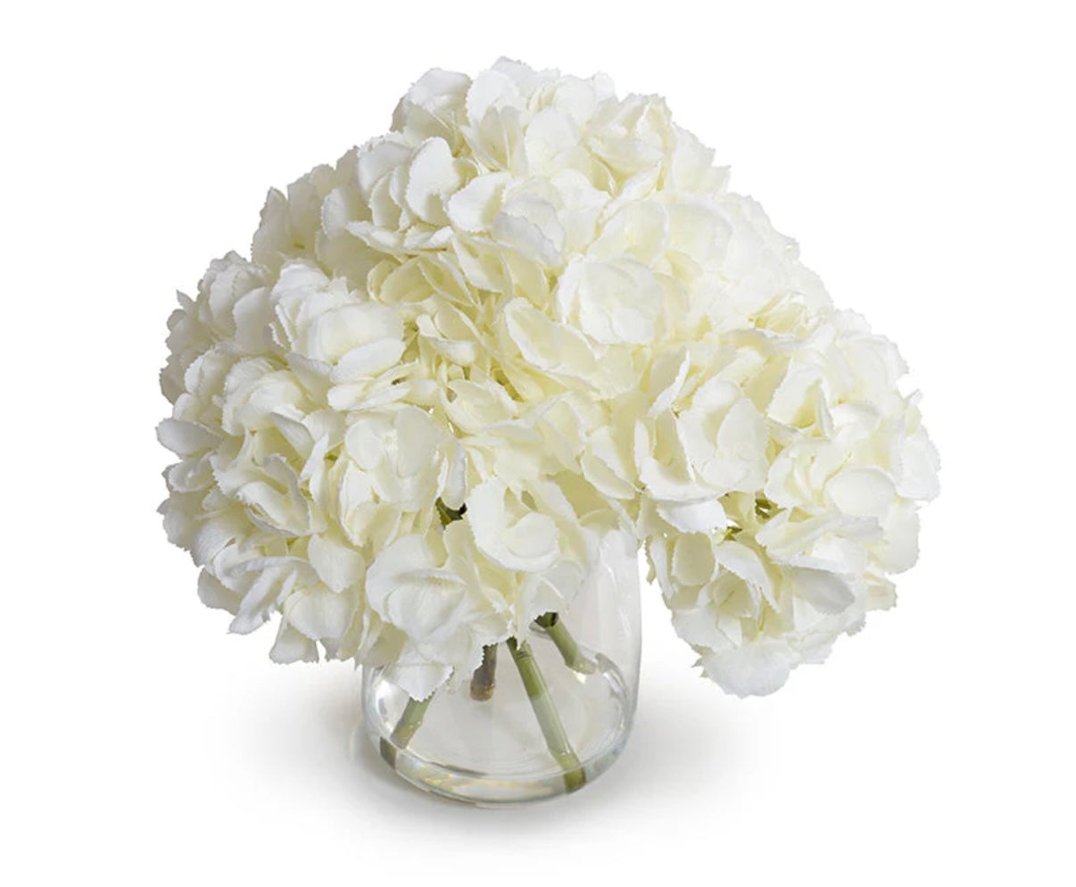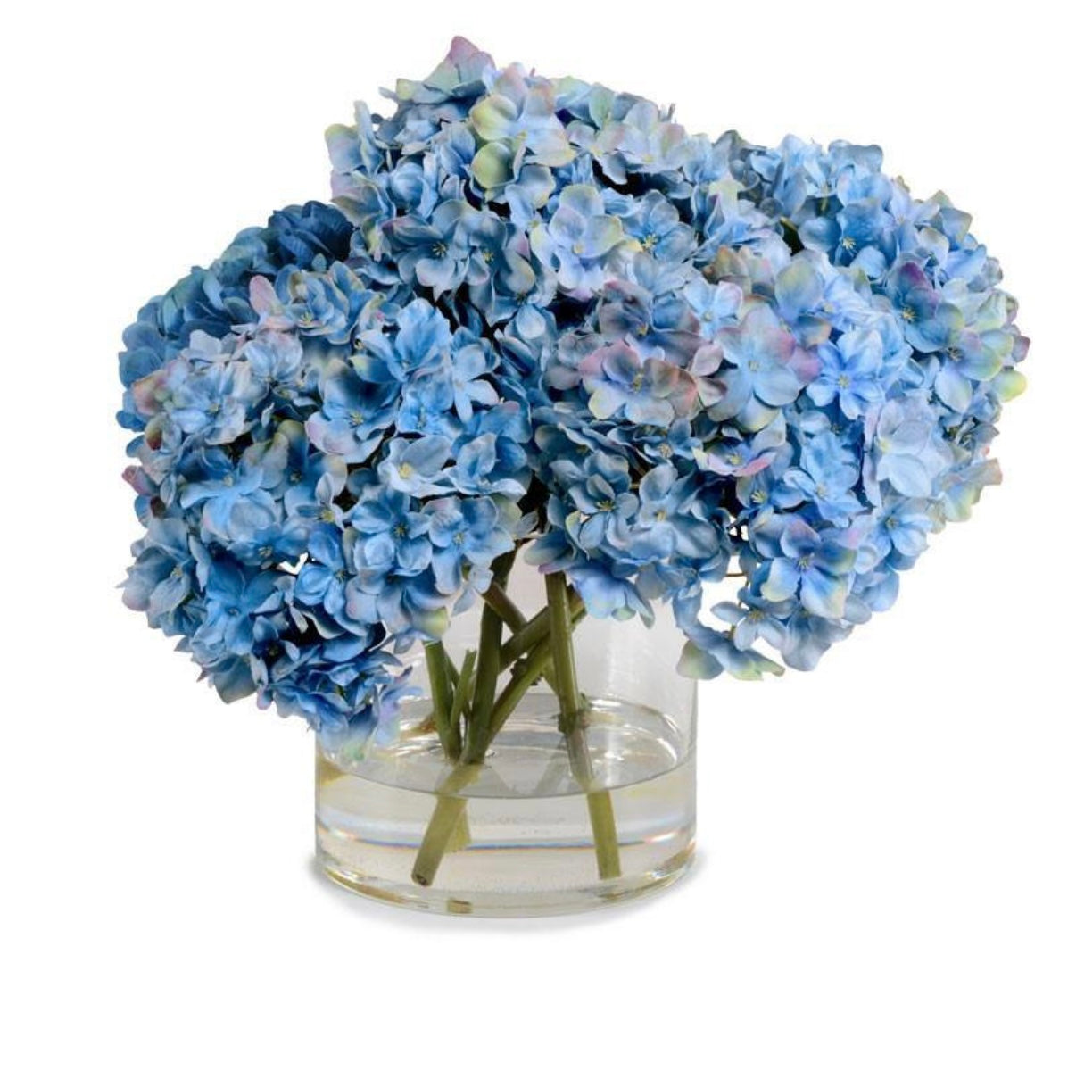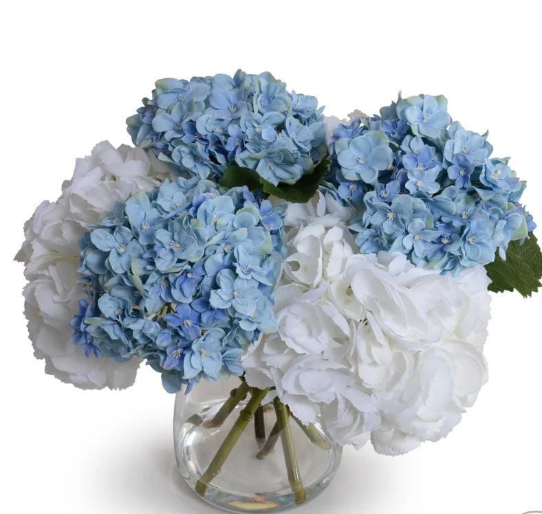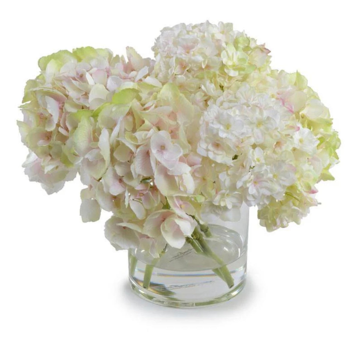 This bountiful arrangement of lifelike Hydrangeas looks fresh-cut from your garden. Large Hydrangea flowers are cut and arranged by hand and set in glass in a clear acrylic solution that looks just like water.