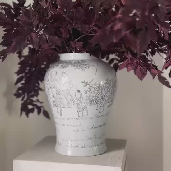 Ink Painting Playful Kids Temple Jar — Handcrafted Porcelain Art Piece