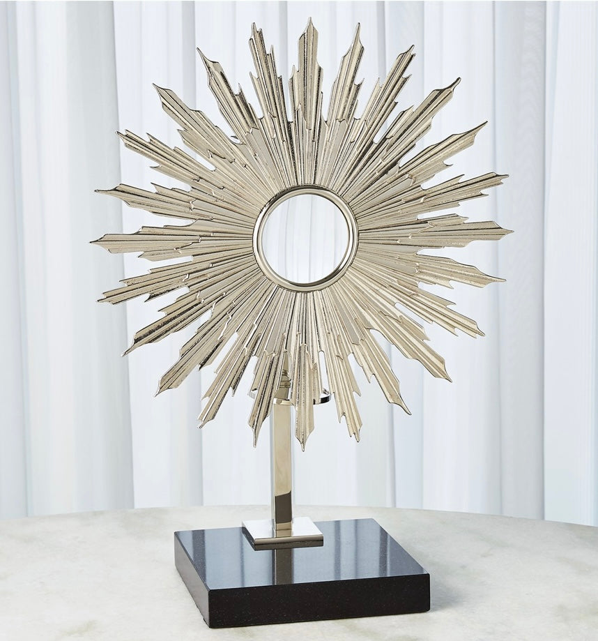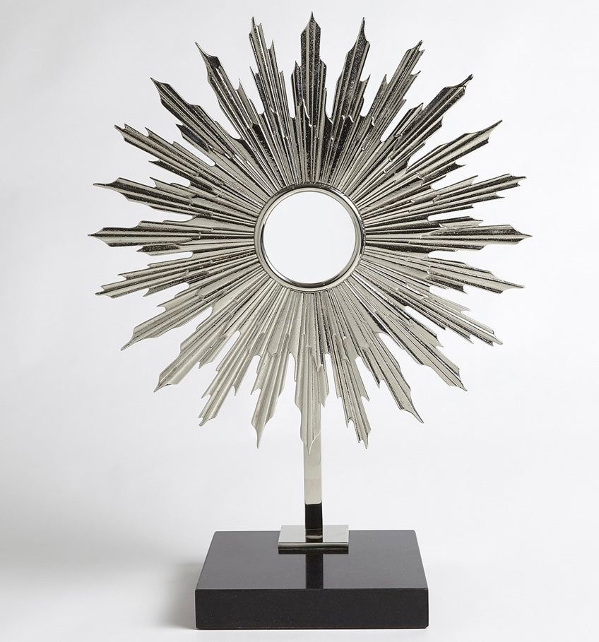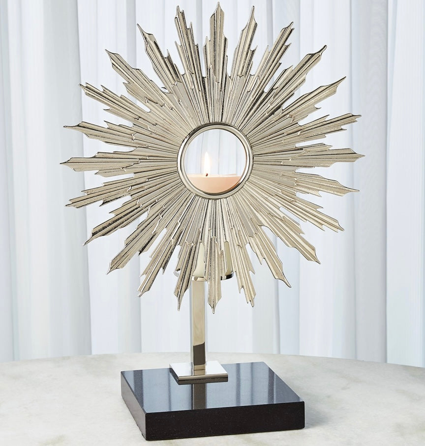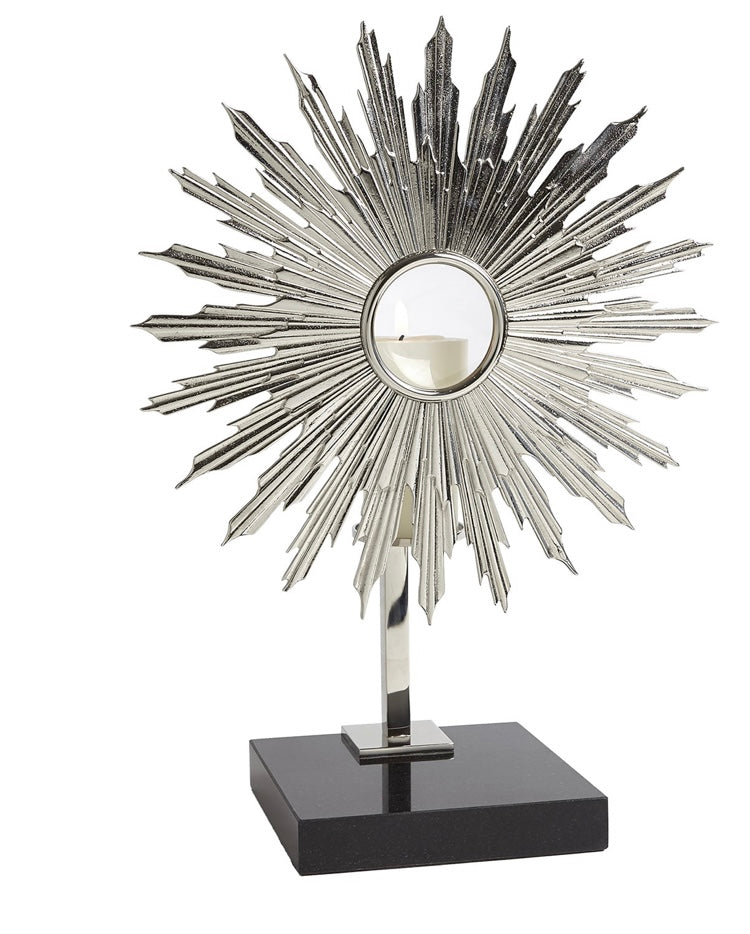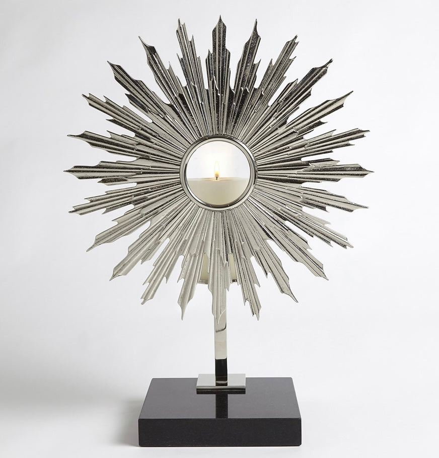 The greatest known baroque sculptor, Gian Lorenzo Bernini was the first to position the rays of the sun around a window. Our light source is a magnifying lens. Made of nickel-plated solid brass on a black granite base and holds a 3"Dia. candle that illuminates through a magnifying glass.