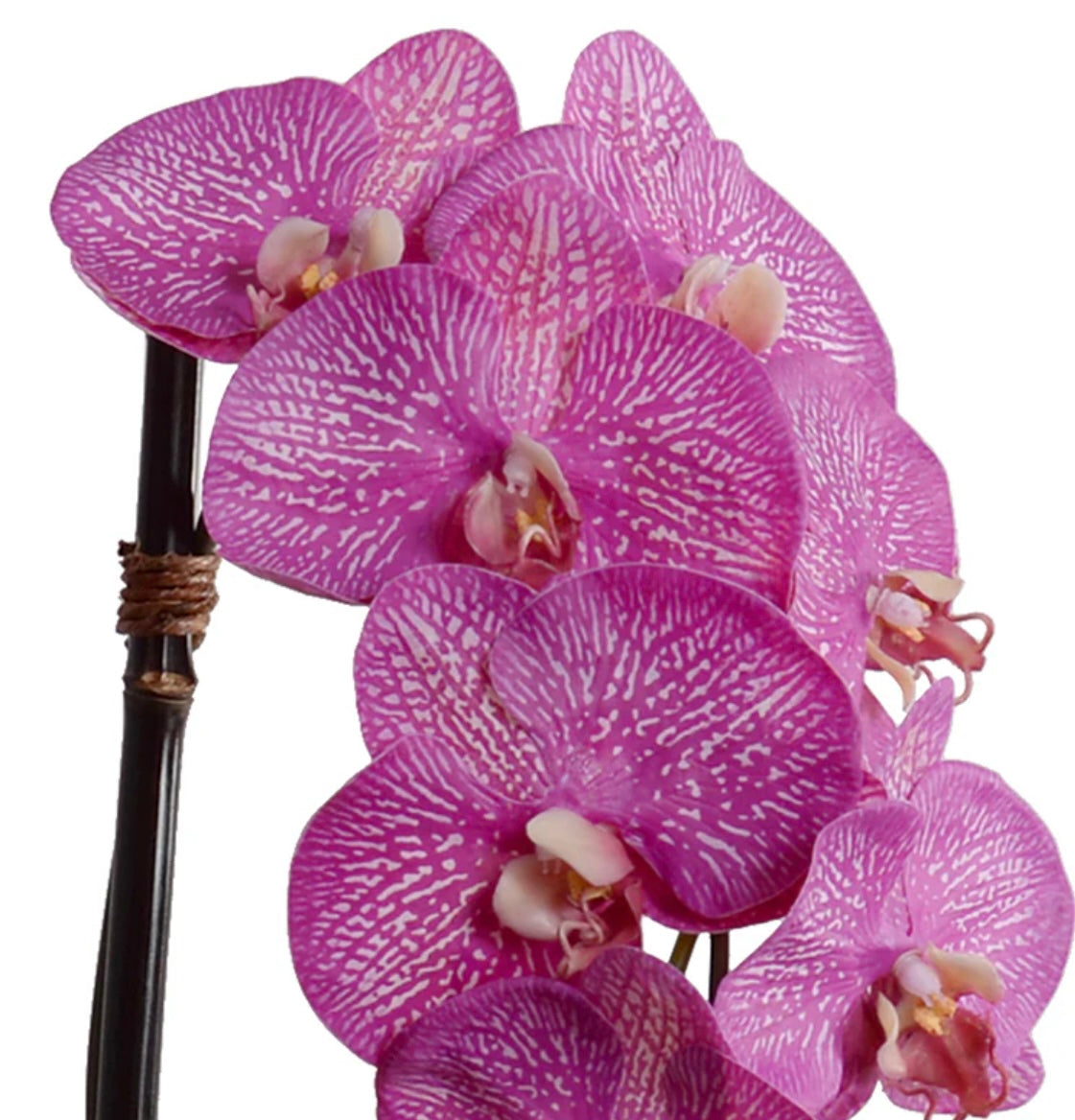 A realistic triple Phalaenopsis orchid plant with large flowers on three artificial stems fastened to natural black bamboo stakes. The plant employs Leaf-it, our patent-pending faux leaf-wrapped base mounted in a clear glass vase. The stems are fastened to natural black bamboo stakes with bark wire and have natural looking leaves at the base. The plant is easily removed from the glass bowl for cleaning, or to display in an alternate container.