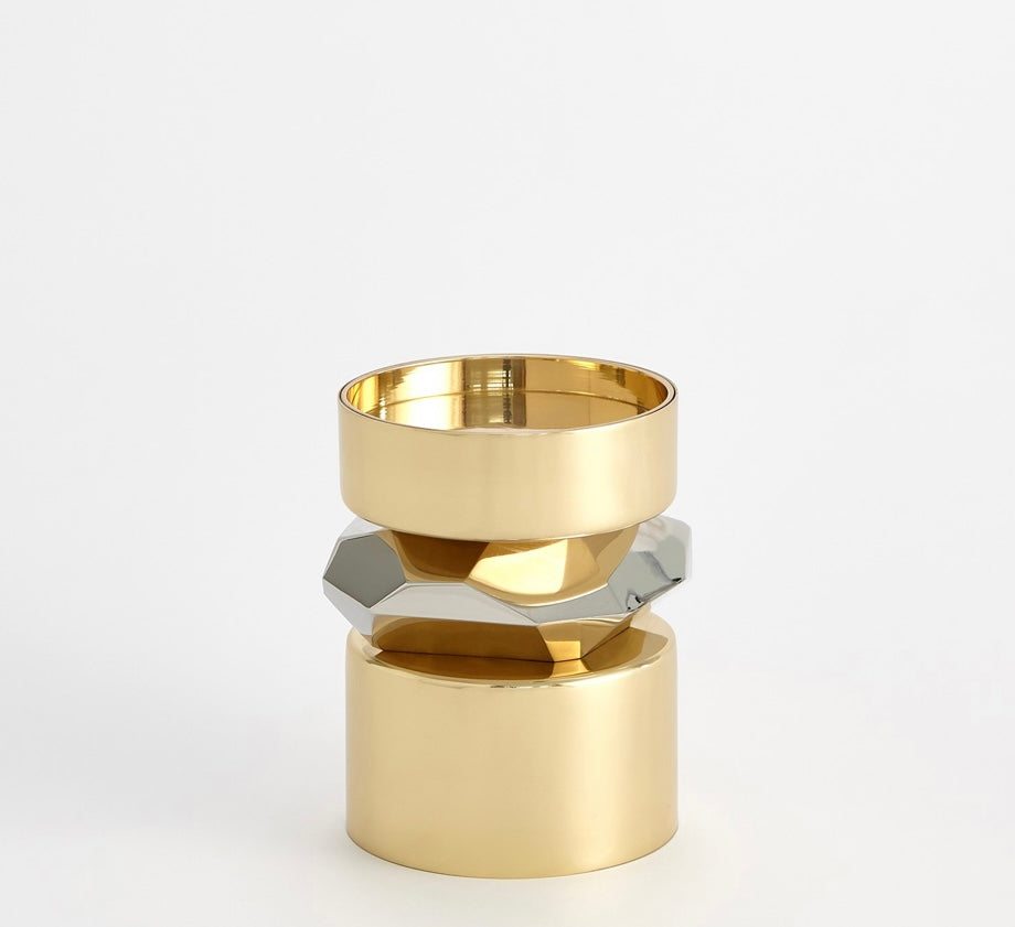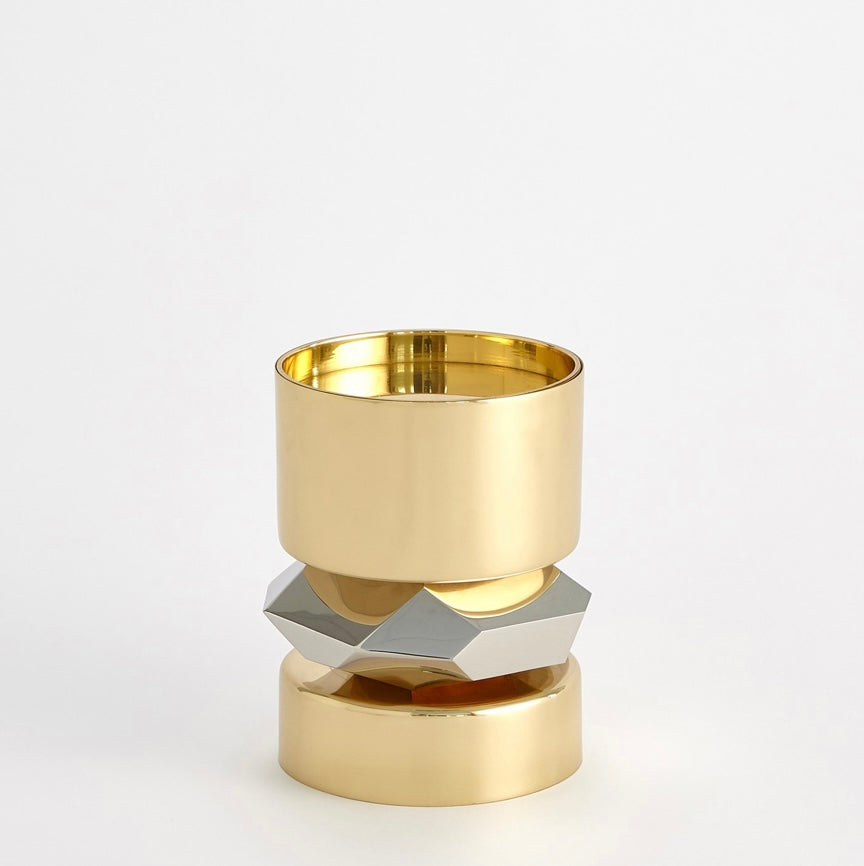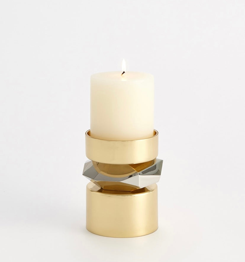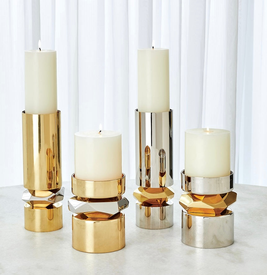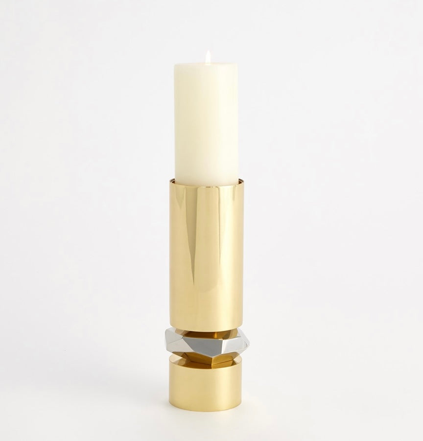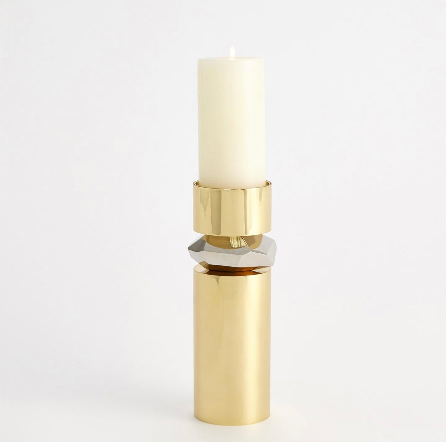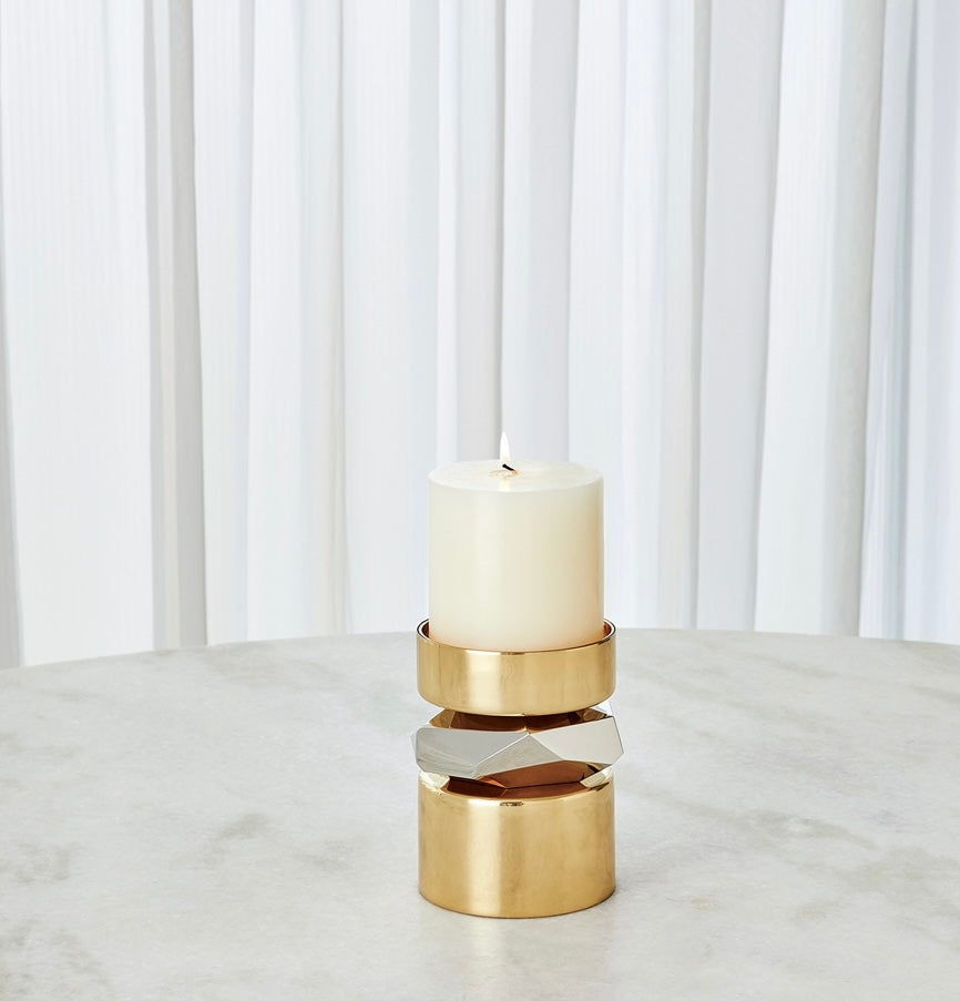 The Romano Brass Candle Holder is made of shiny brass and nickel-plated brass. Holds 3 inch pillar candle.