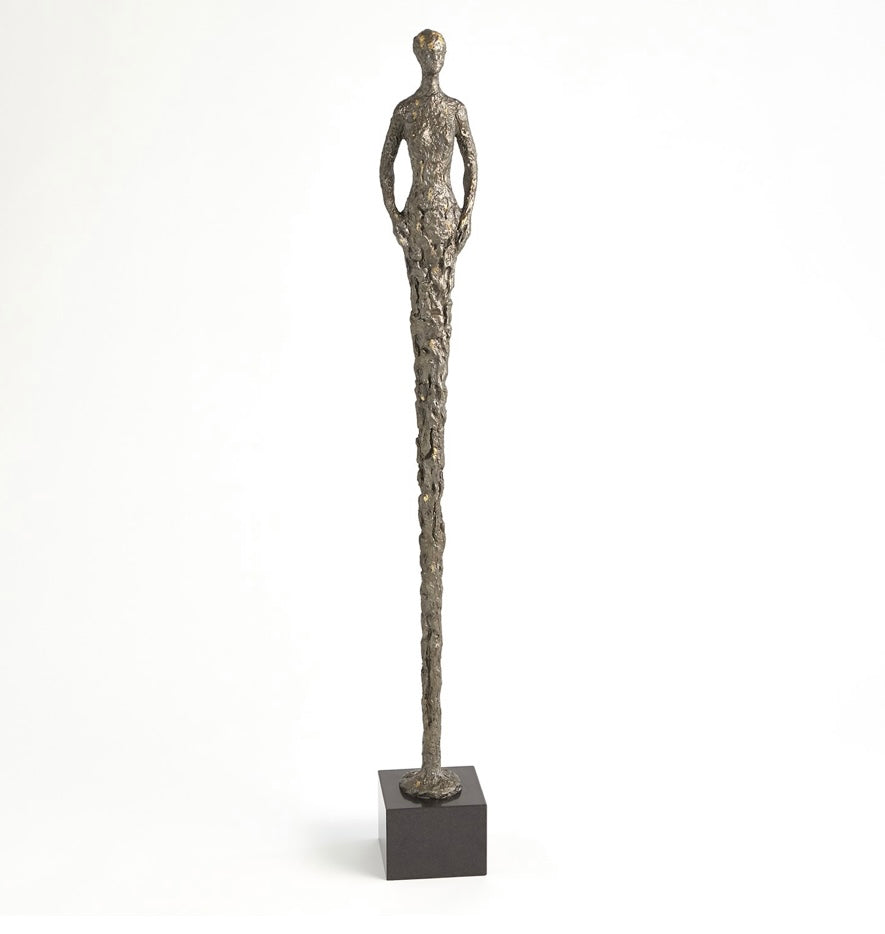 The Stretch Man and Woman are made of sand casted iron with an antique natural iron finish on a black marble base.