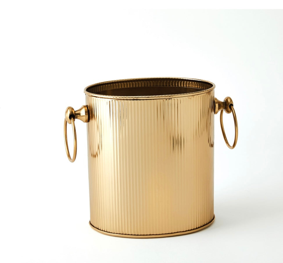 The Winston Ice Buckets are crafted from durable stainless steel with an elegant brass finish, featuring a sophisticated fluted design. Each bucket includes a removable liner for easy cleaning, perfect for serving chilled drinks at any gathering.